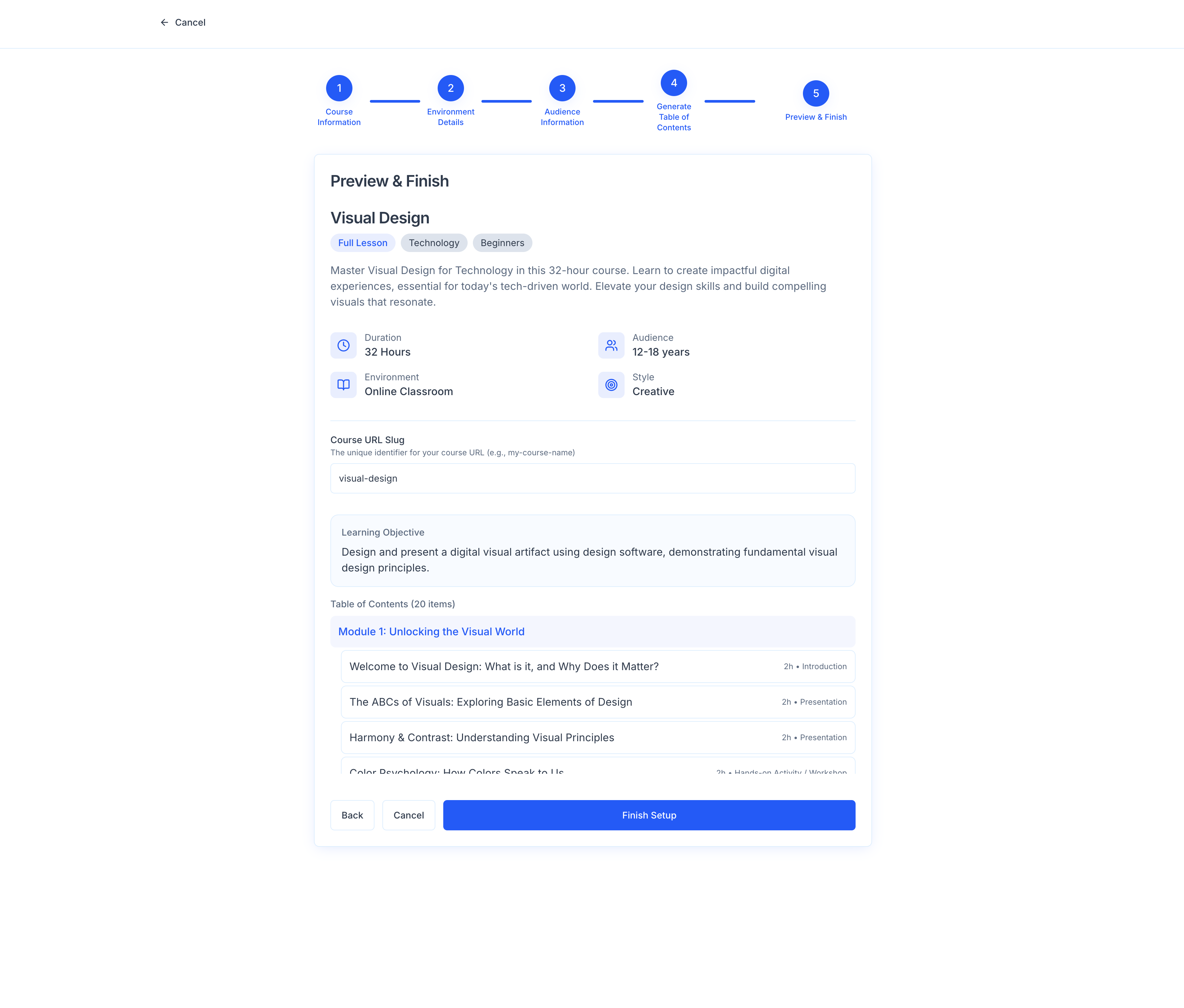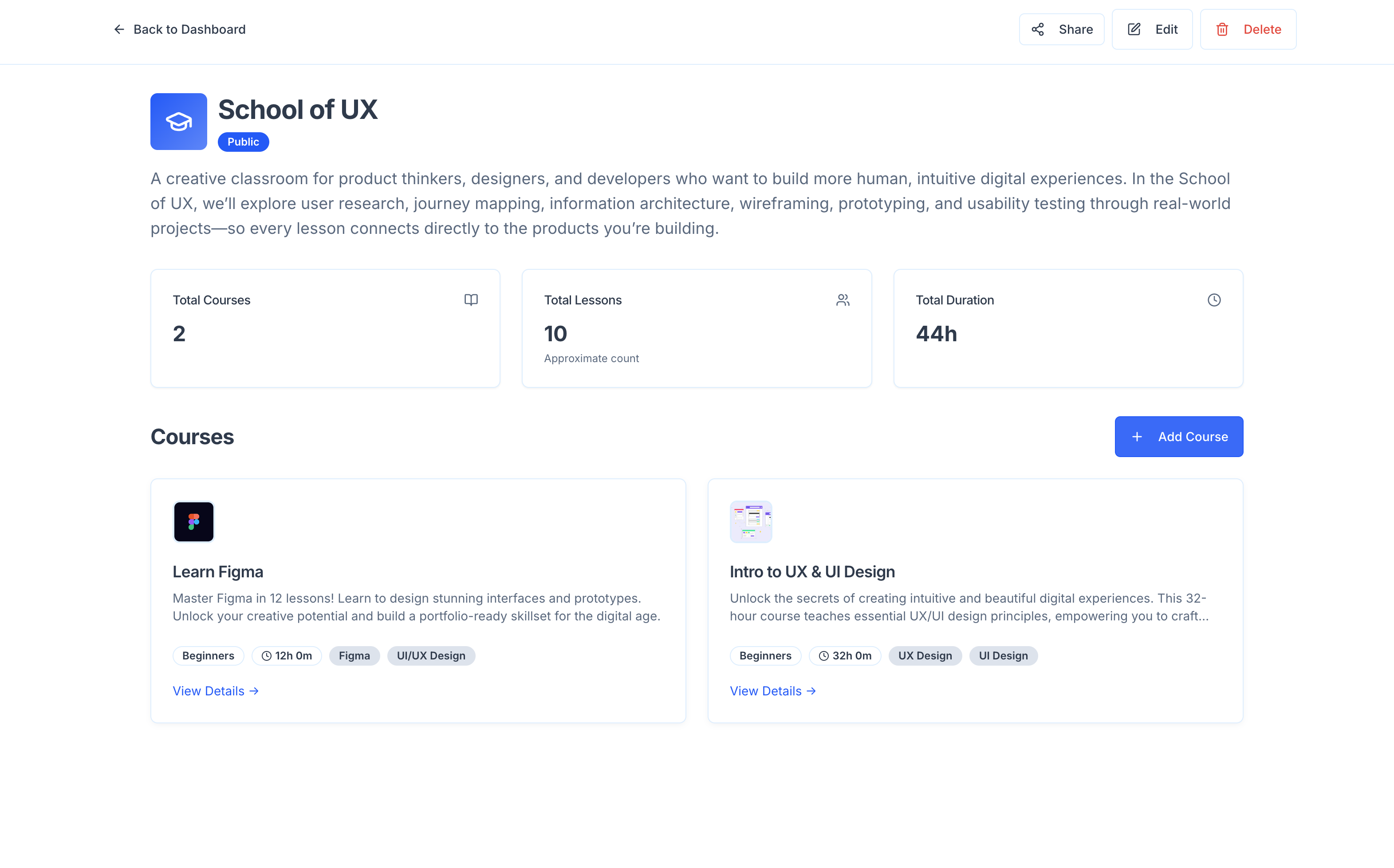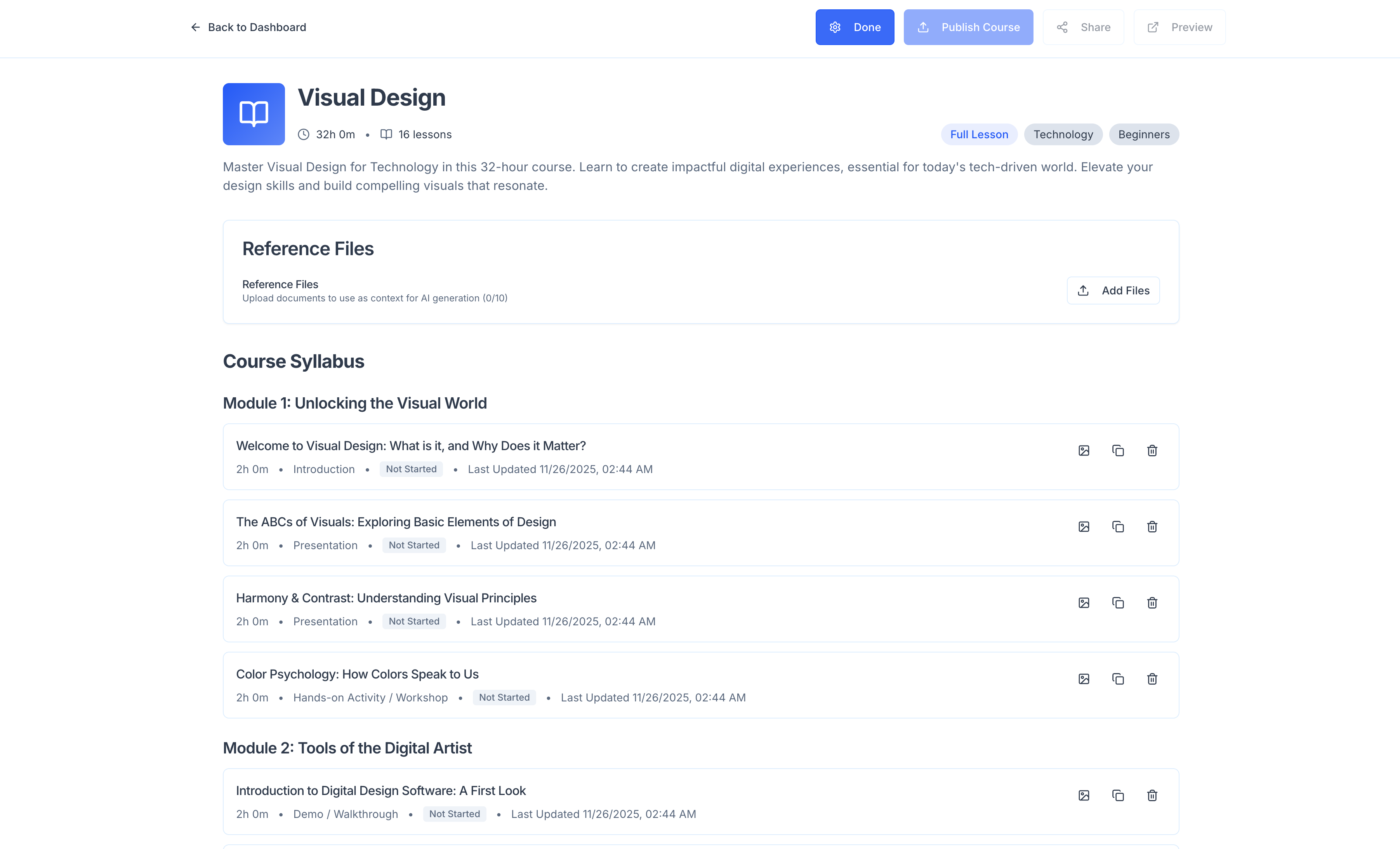 Courses are the core learning experiences in Plaibx. You’ll define what the course is about, who it’s for, how it’s delivered, and then let Plaibx help you generate a full syllabus you can build lessons from.