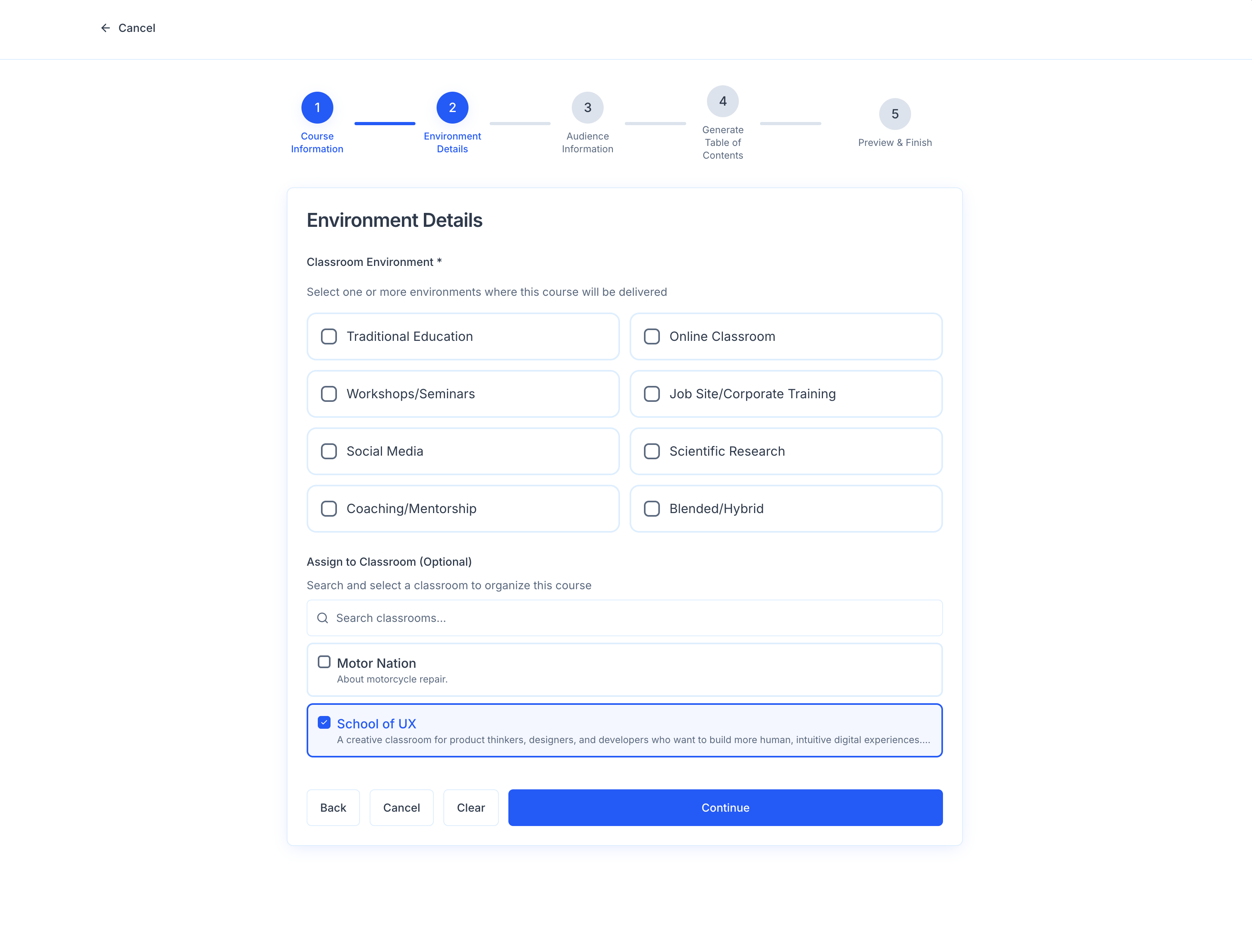 Both options open the course creation flow, with the new course automatically linked to this classroom.