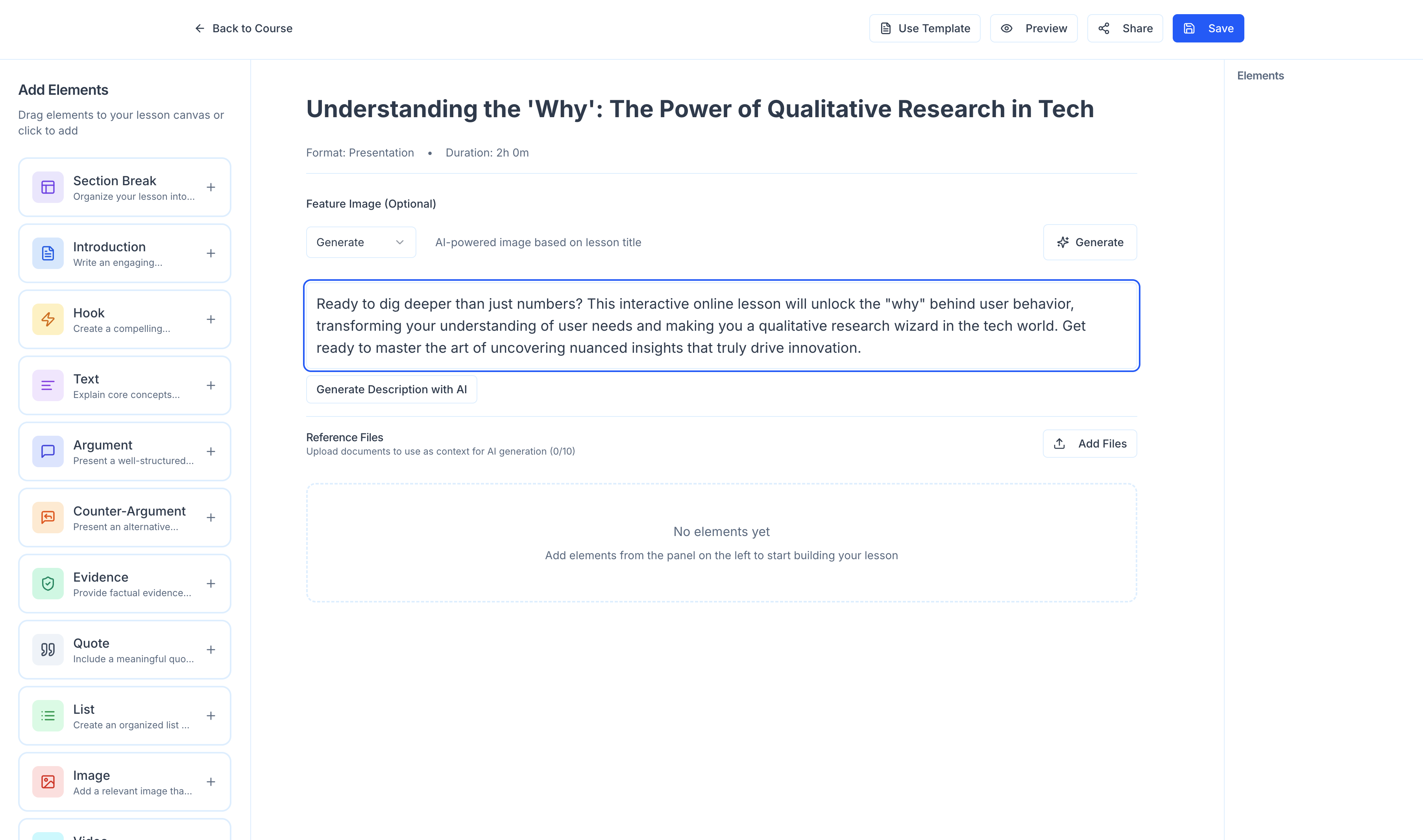 Lessons are where your course content comes to life. In the Lesson Builder, you combine text, media, activities, and quizzes—then let Plaibx’s AI help you fill in the details.