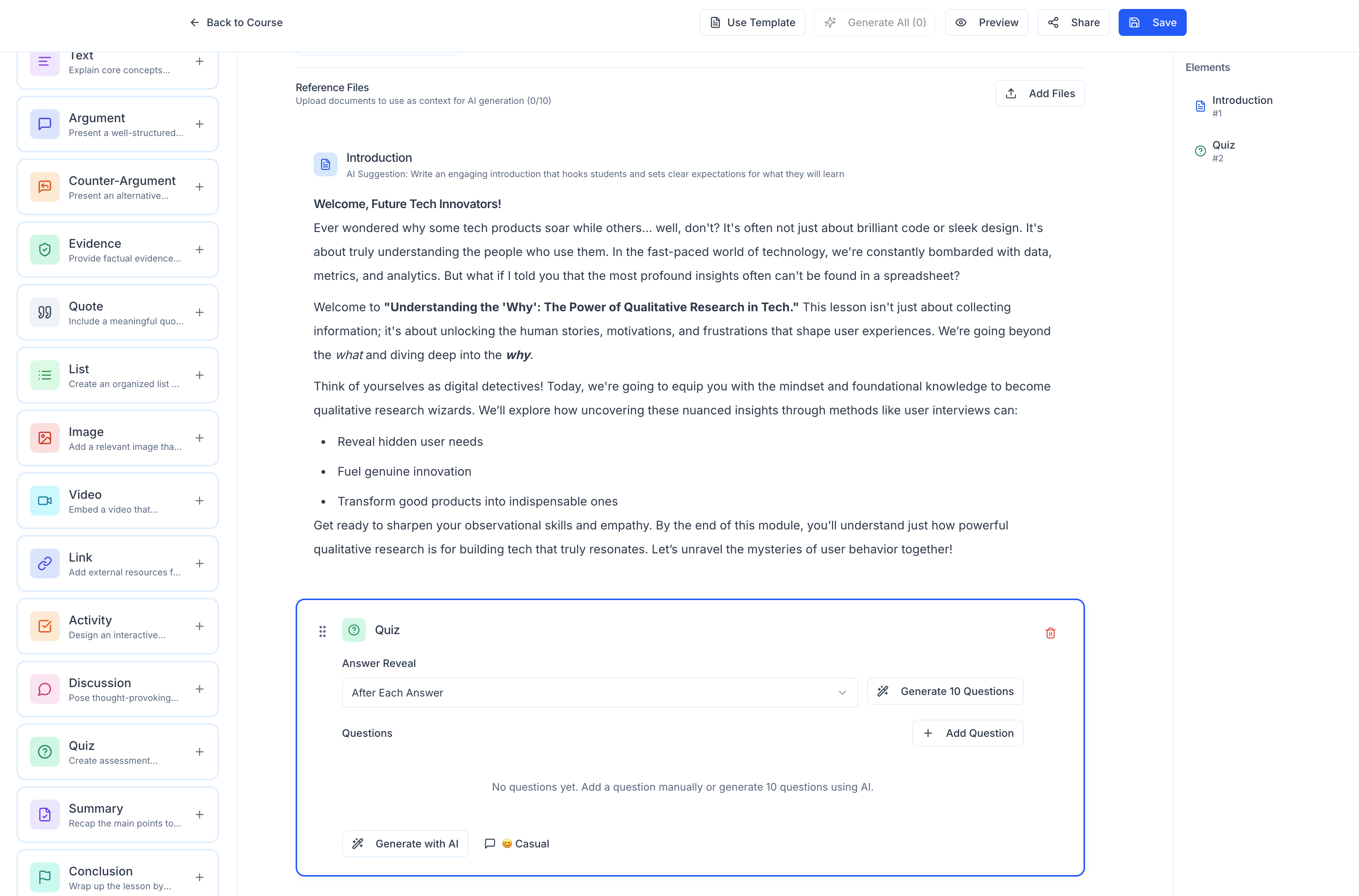 Quizzes help you check understanding and reinforce learning. The Quiz element is designed to be flexible and AI-assisted.