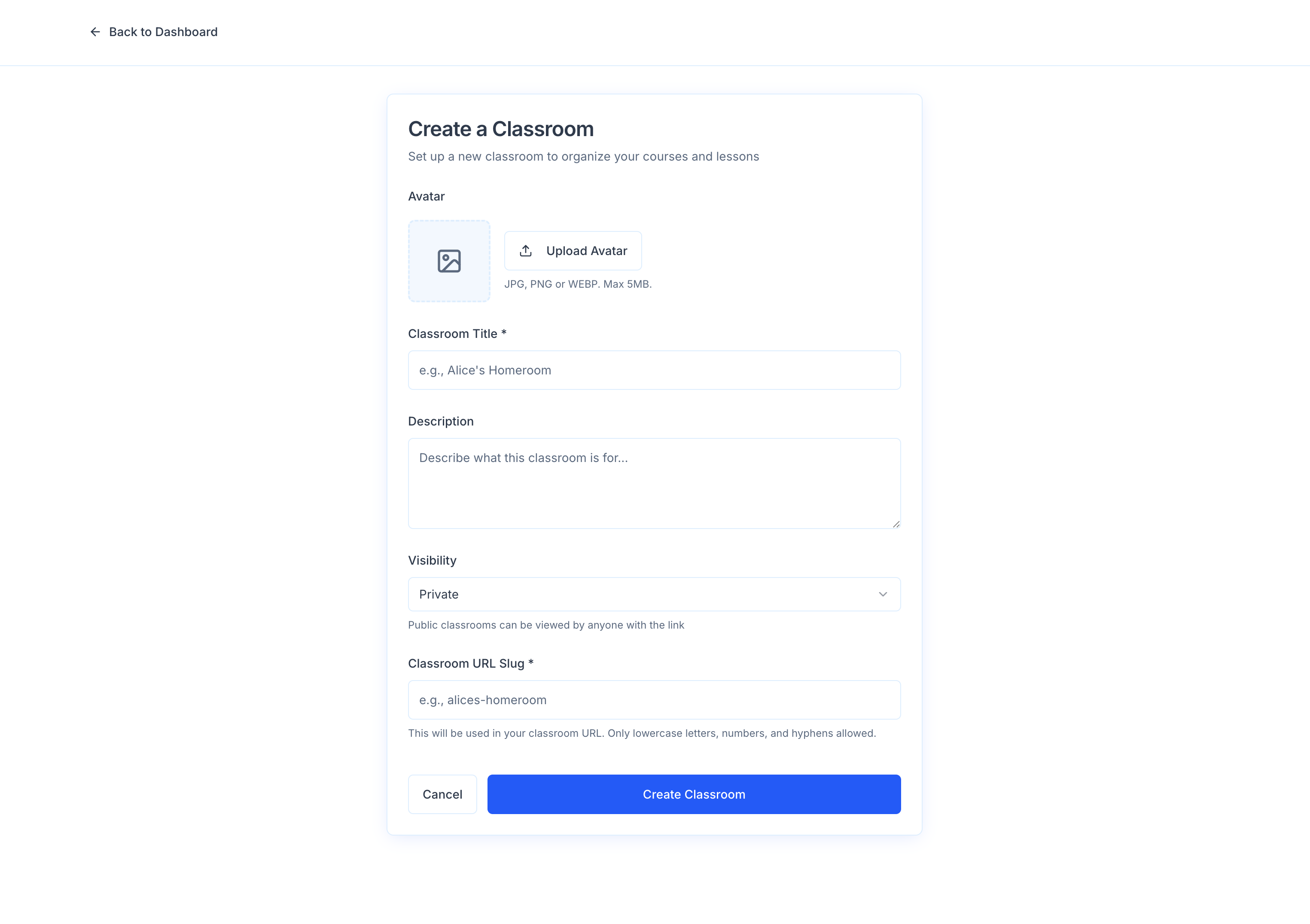 Tip: Use a descriptive Classroom Title and slug so your share URL looks clean and trustworthy.