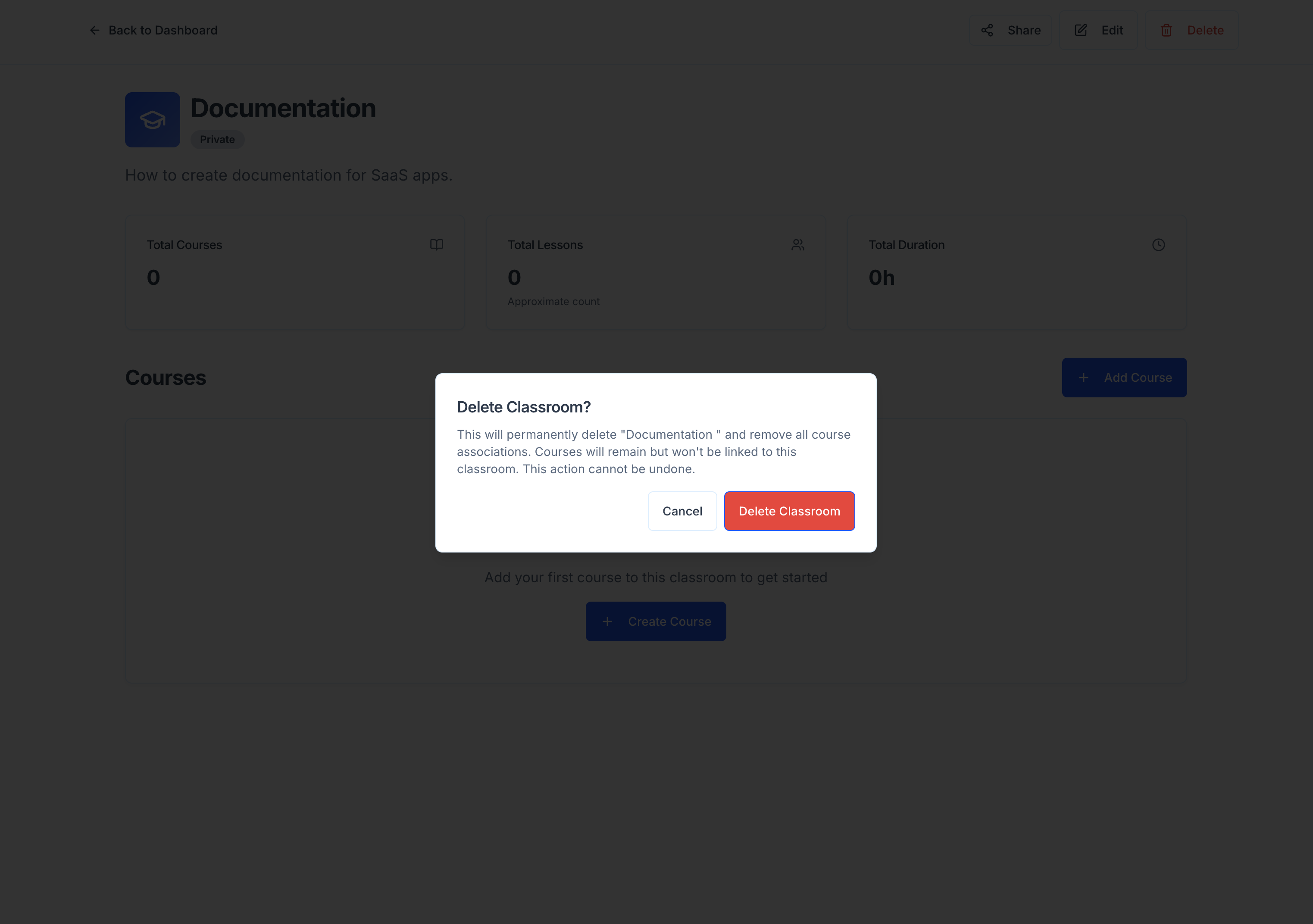 Once deleted, the classroom will disappear from your Dashboard, but any courses that were inside it will still be available under the Courses tab.